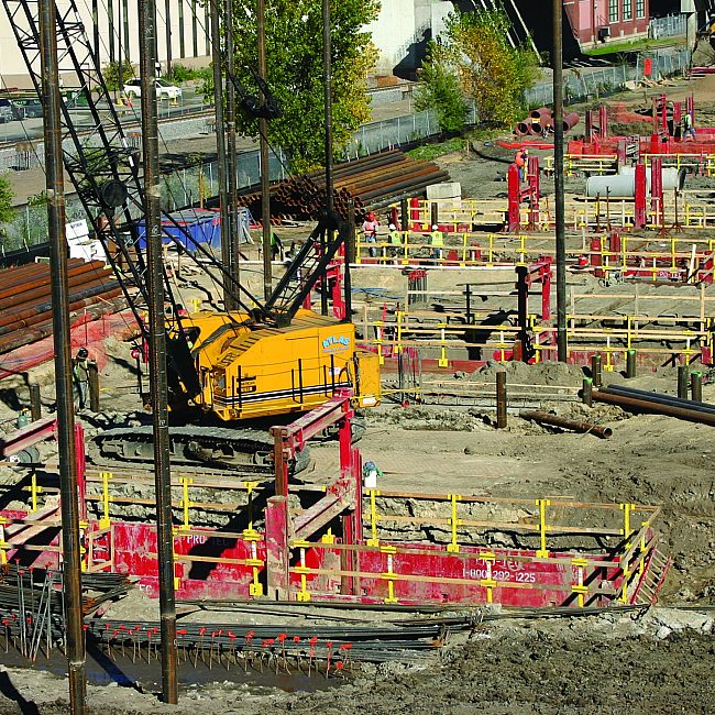 The Pro-Tec Equipment Slide Rail System is a dig-and-push style trench shoring system. With its modular, flexible design the system can work with a wide variety of shapes and sizes. The Pro-Tec Equipment Slide Rail Shoring System is installed from the top down and removed from the bottom up, minimizing size of excavations, soil disturbances and restoration time and cost. The installation is done with low vibration, providing soil support for excavations, adjacent structures and existing utilities.