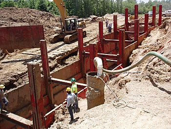 For example, the accompanying picture shows a project measuring 12’ deep x 12’ wide x 69’ long (using 4 bays of 16’ panels). The project involved multiple fuel tanks being installed at Detroit Metro Airport with the aid of a PC 600 Komatsu excavator.